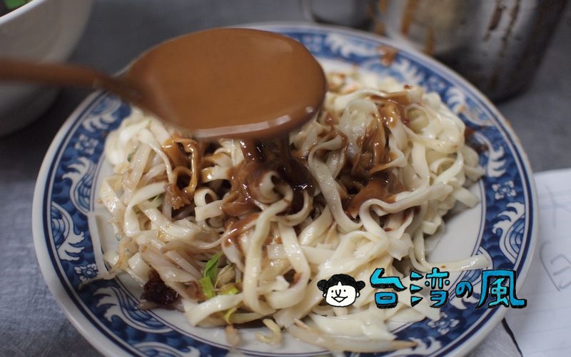 おすすめの麺料理「白麵」のスープ無し(白乾麵)です。真っ白い平打ち麺にもやし、肉燥、油蔥酥(揚げネギ)をトッピングしてあるシンプルな料理。